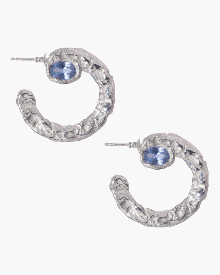 Textured silver hoop earring with oval aquamarine CZ detail.