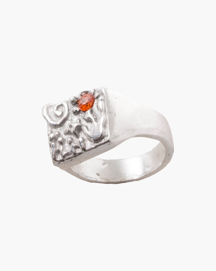 Carved silver ring with zirconia. The carving represents an interior botanical garden, where each plant is the result of an experience or feeling.
