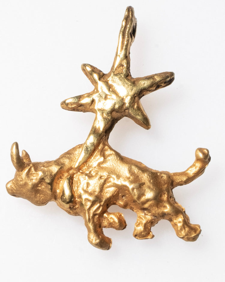 Gold-plated pendant of a running bull struck by a sacred lightning bolt. Although it appears to be the sun striking, the moon is behind it.